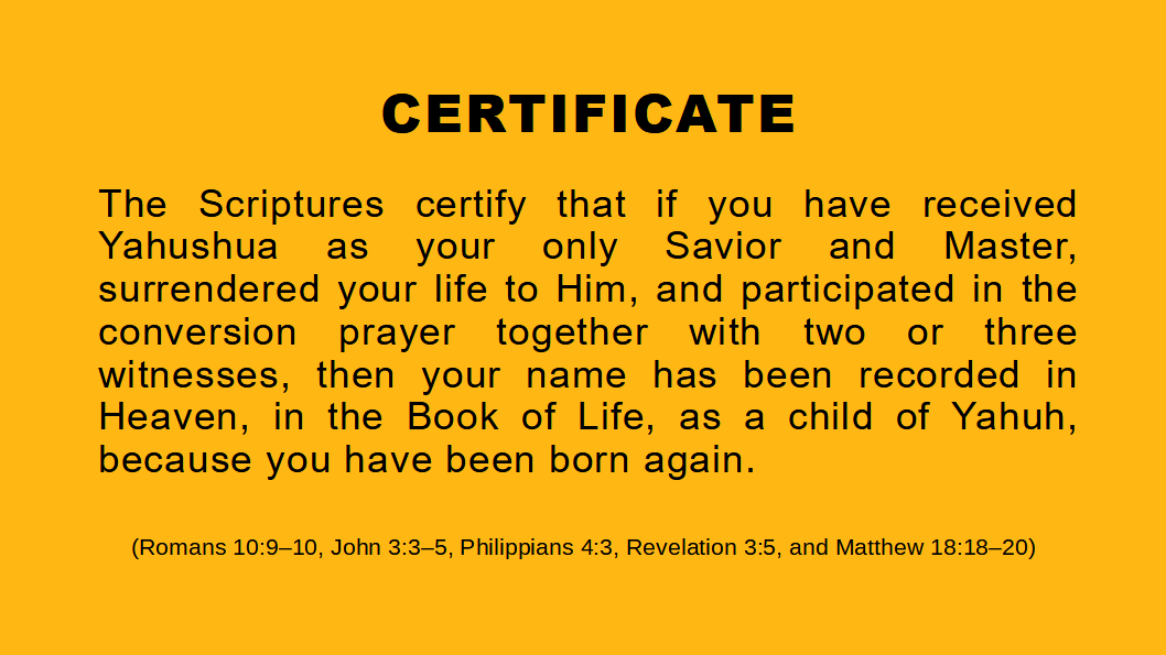 Done! You have converted, and your conversion has been recorded in Heaven. Download your certificate of conversion to the Savior Yahushua and share it with as many people as possible, encouraging everyone to convert online as well, so they can be saved, raptured, and live in Heaven forever after departing this life.