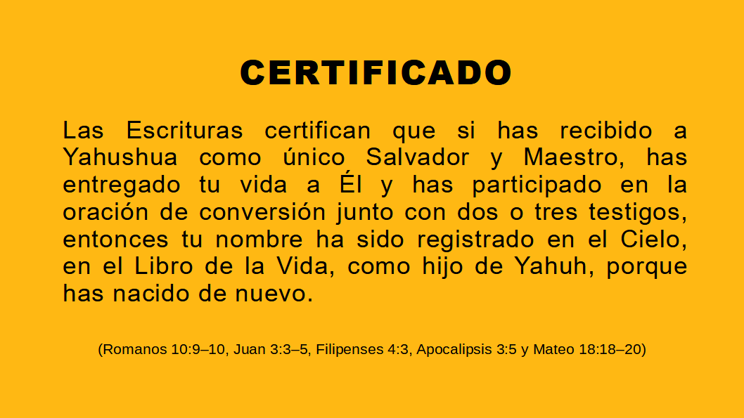 ¡Listo! Te has convertido y tu conversión ha sido registrada en el Cielo. Descarga tu certificado de conversión al Salvador Yahushua y compártelo con el mayor número de personas posible, animando a todos a convertirse también en línea, para asegurarse de ser salvos, arrebatados y vivir en el Cielo para siempre cuando partan de esta vida.
